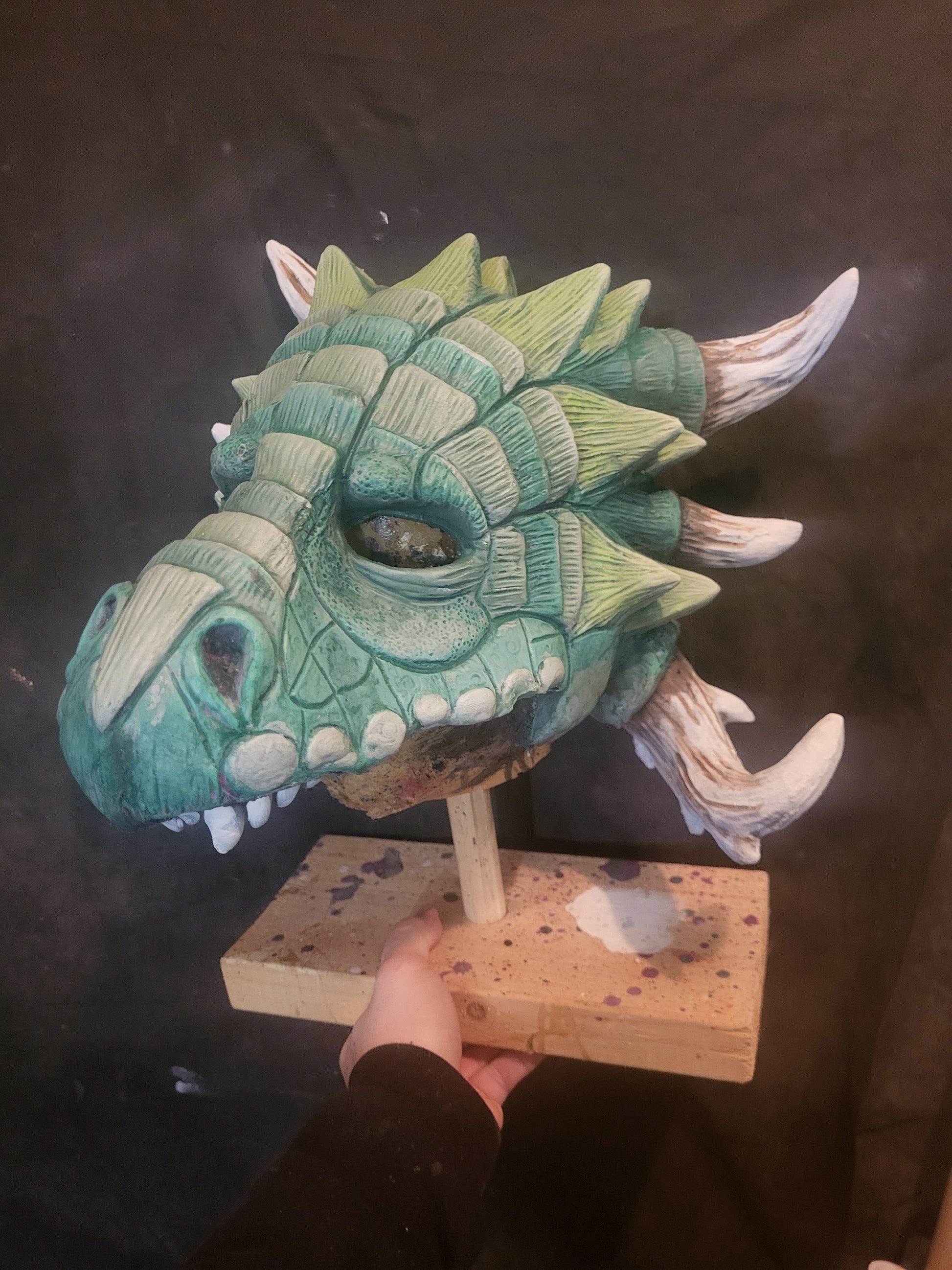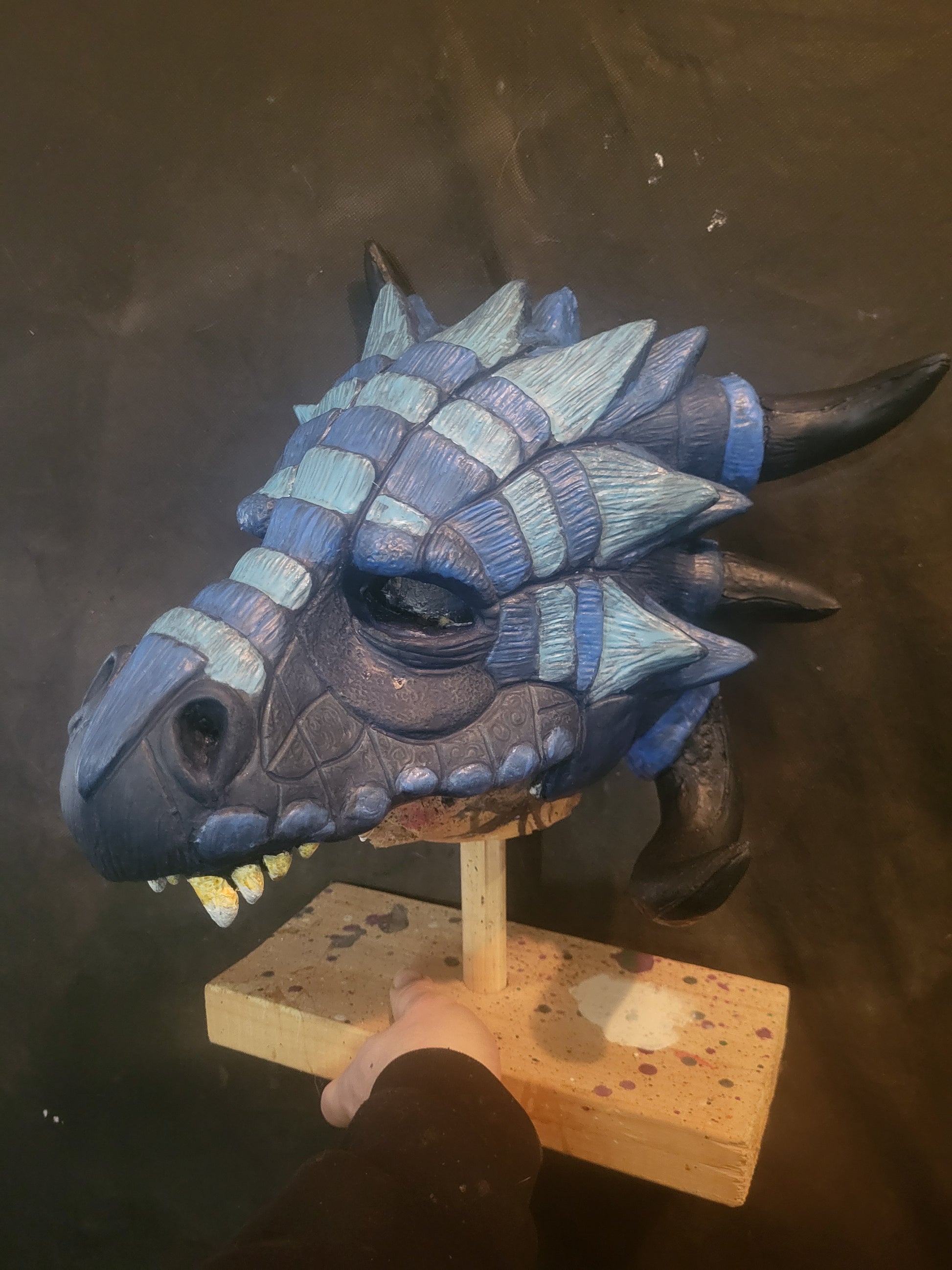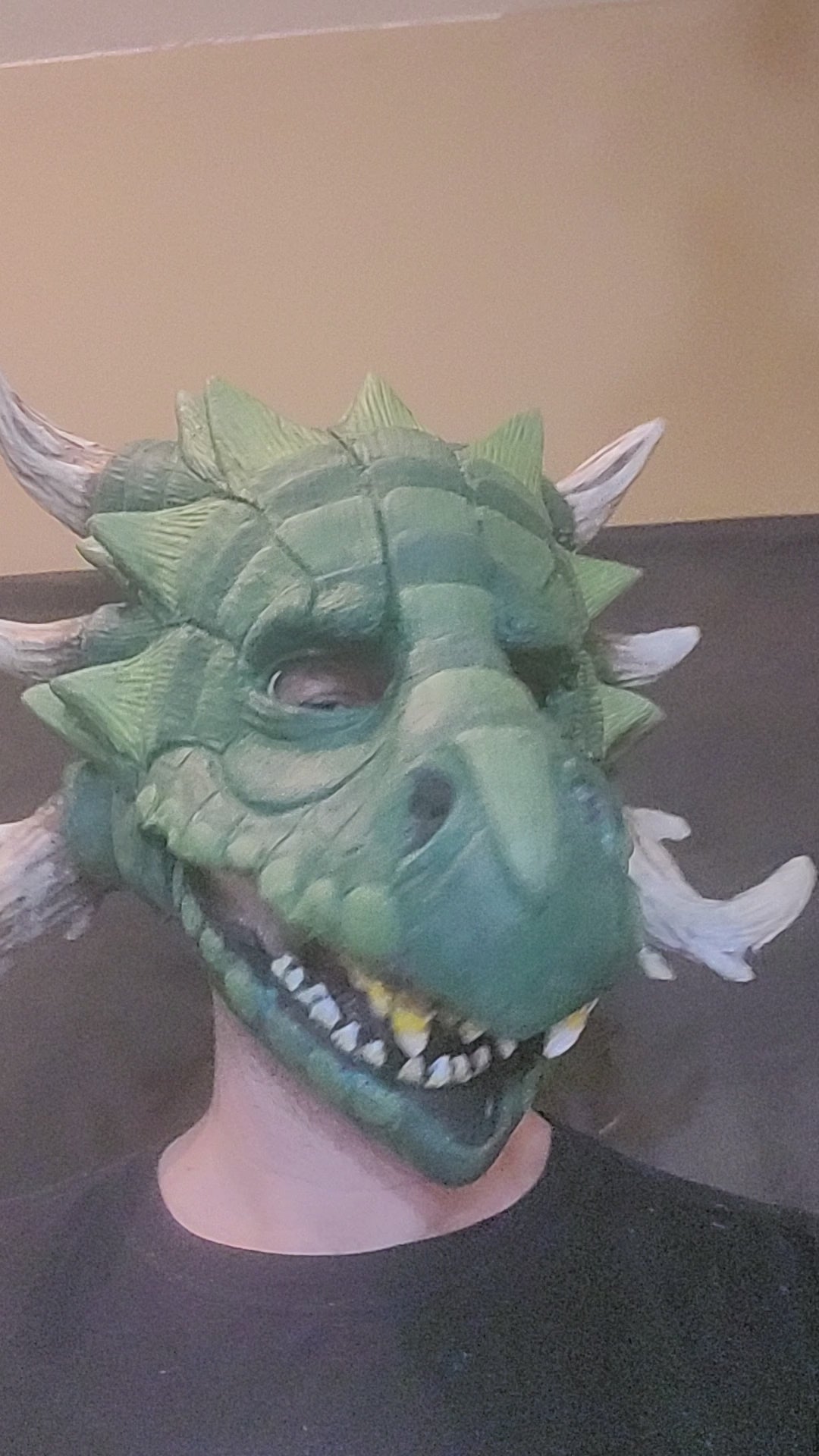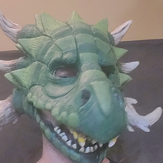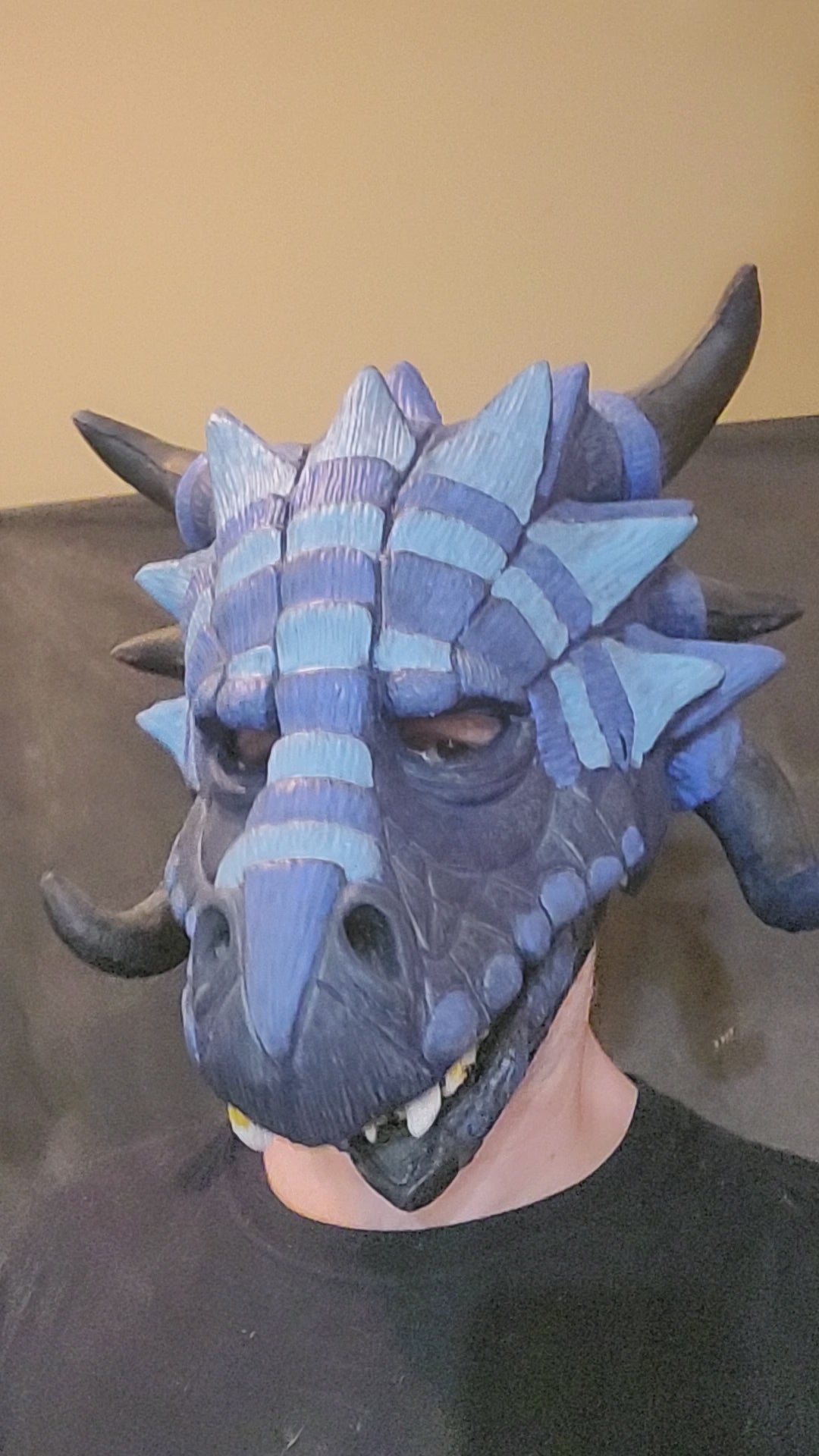 Latex and polyfoam mask with leather interior and moveable jaw.