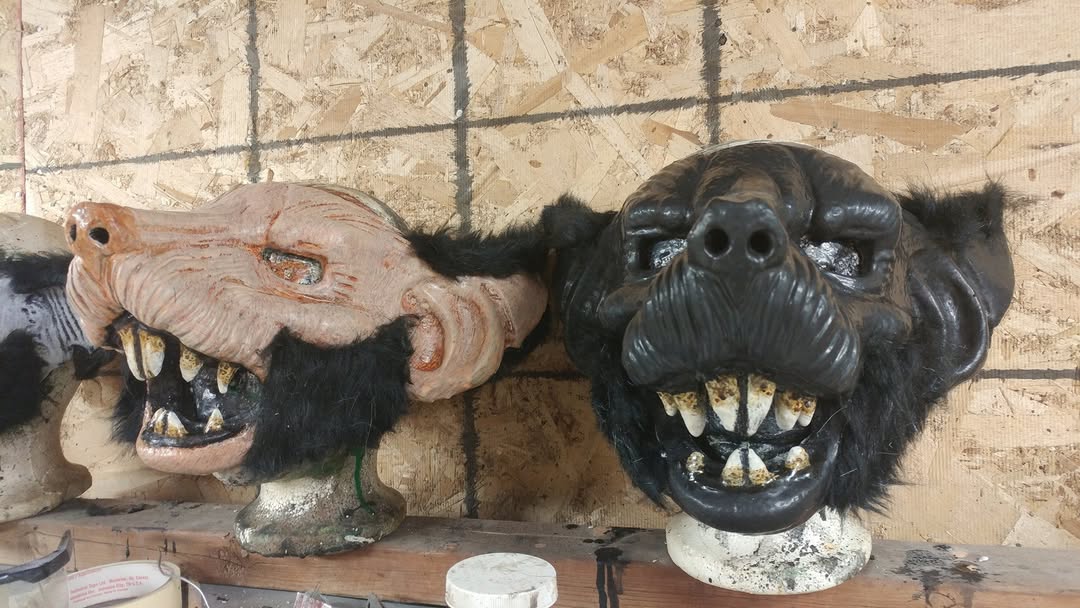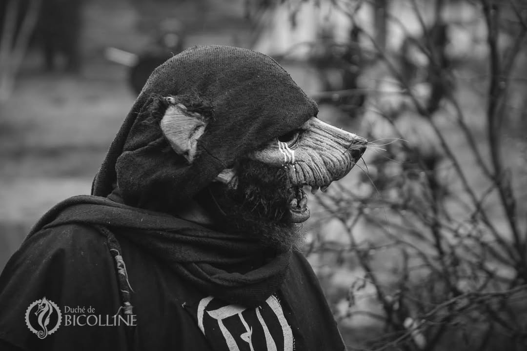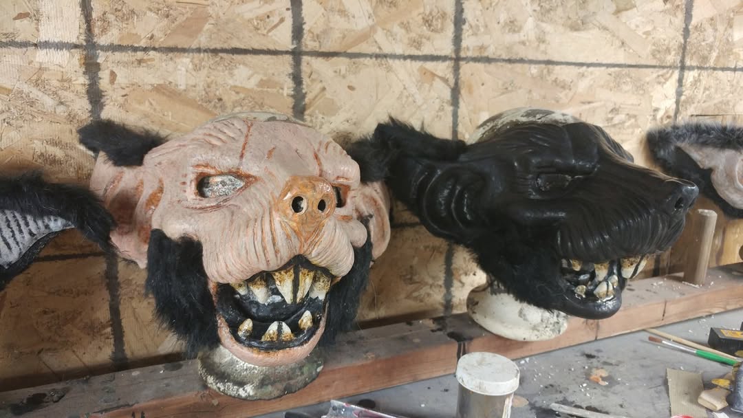 Masque en latex renforcé de tissu et de durcisseur. Poil synthétique et crin de cheval. Elastique en tissu à l' arrière.