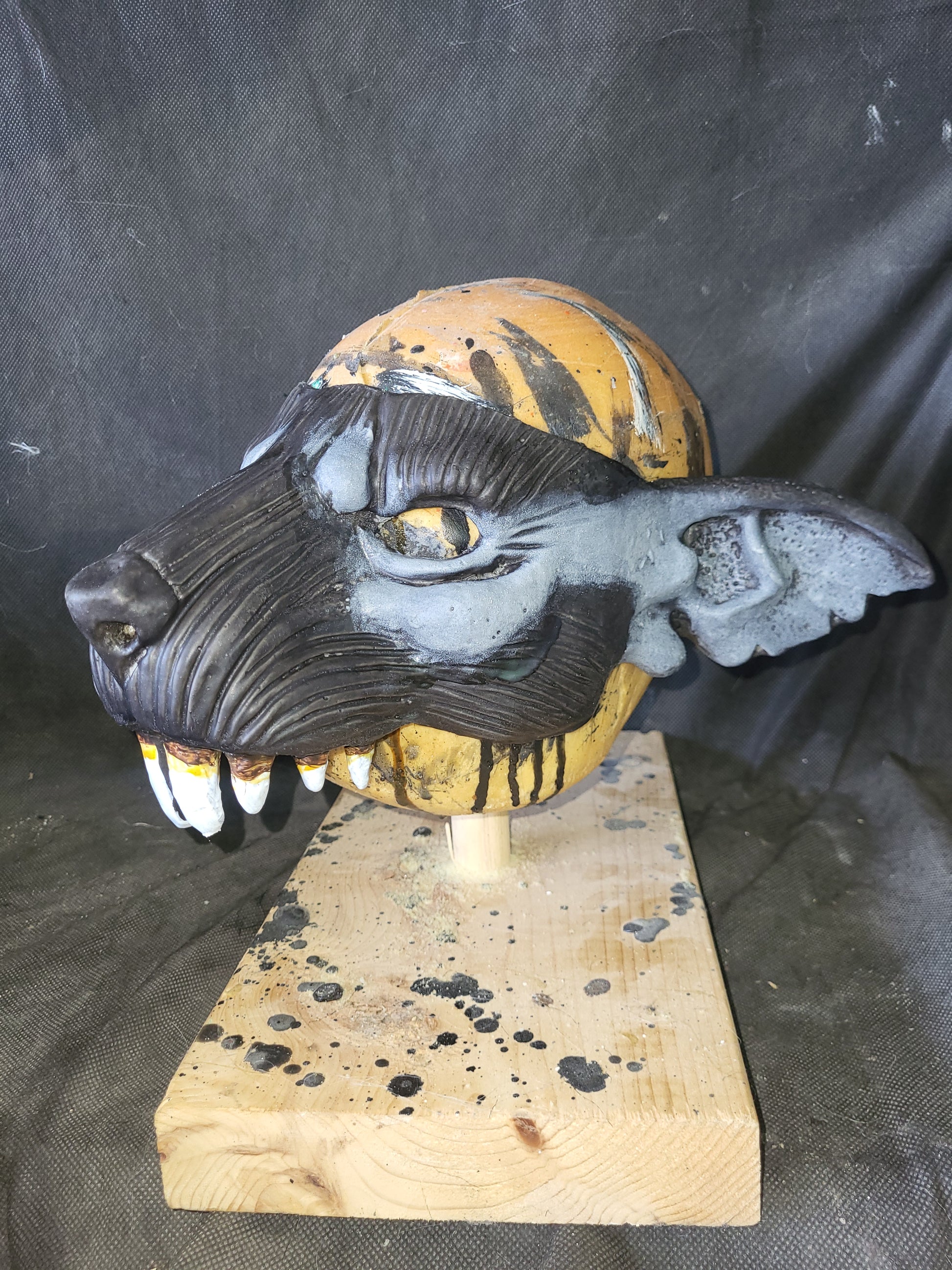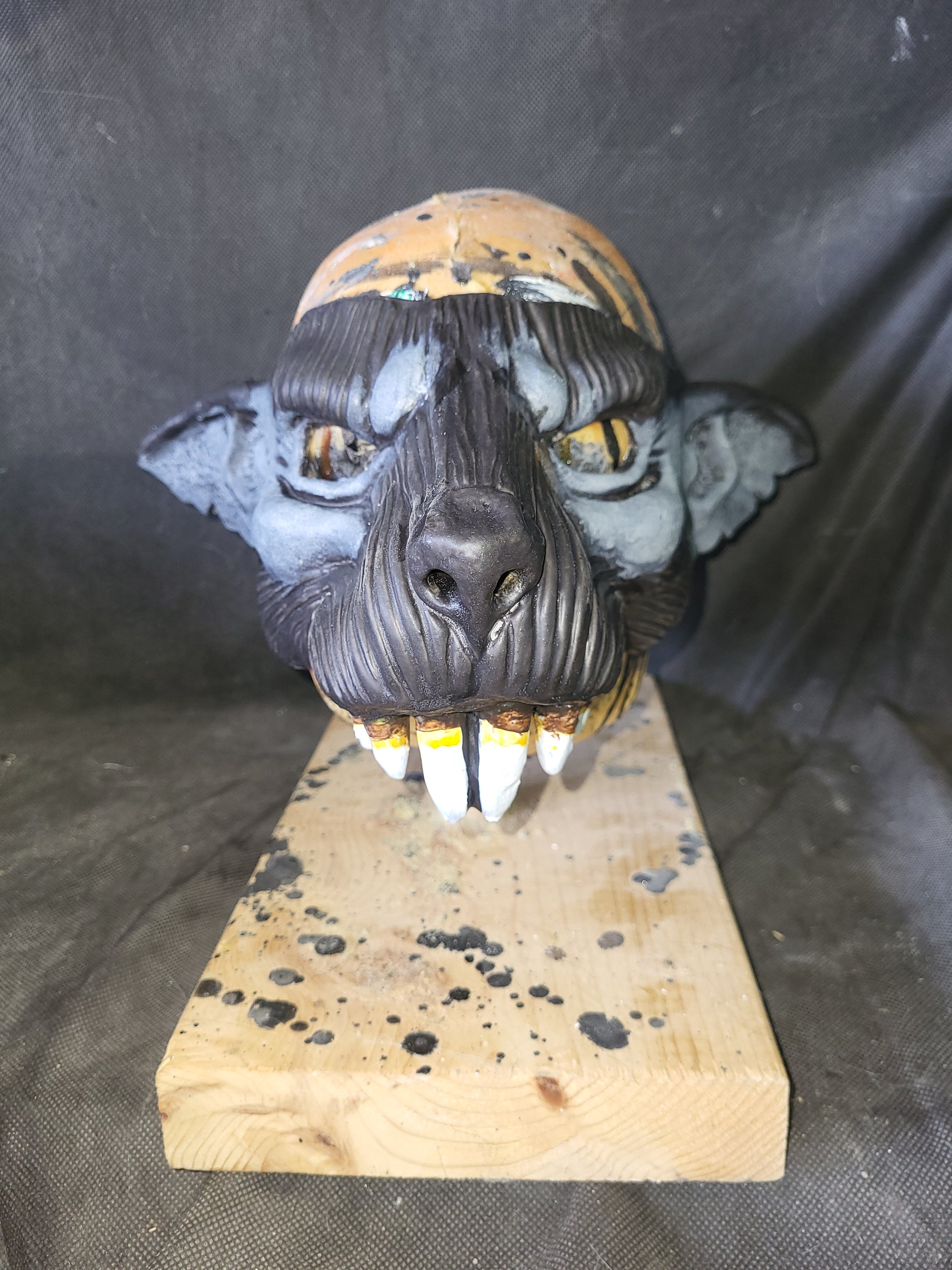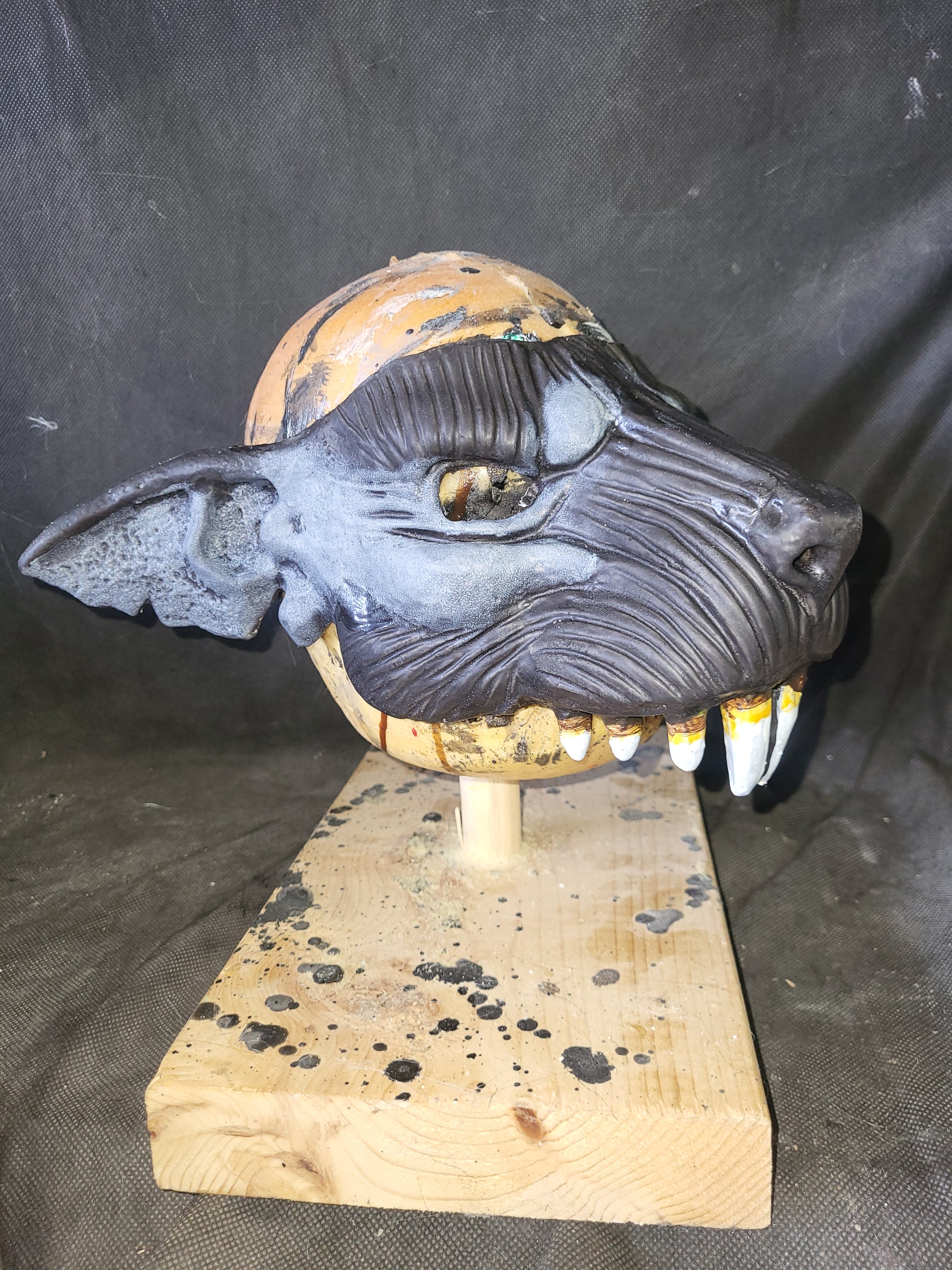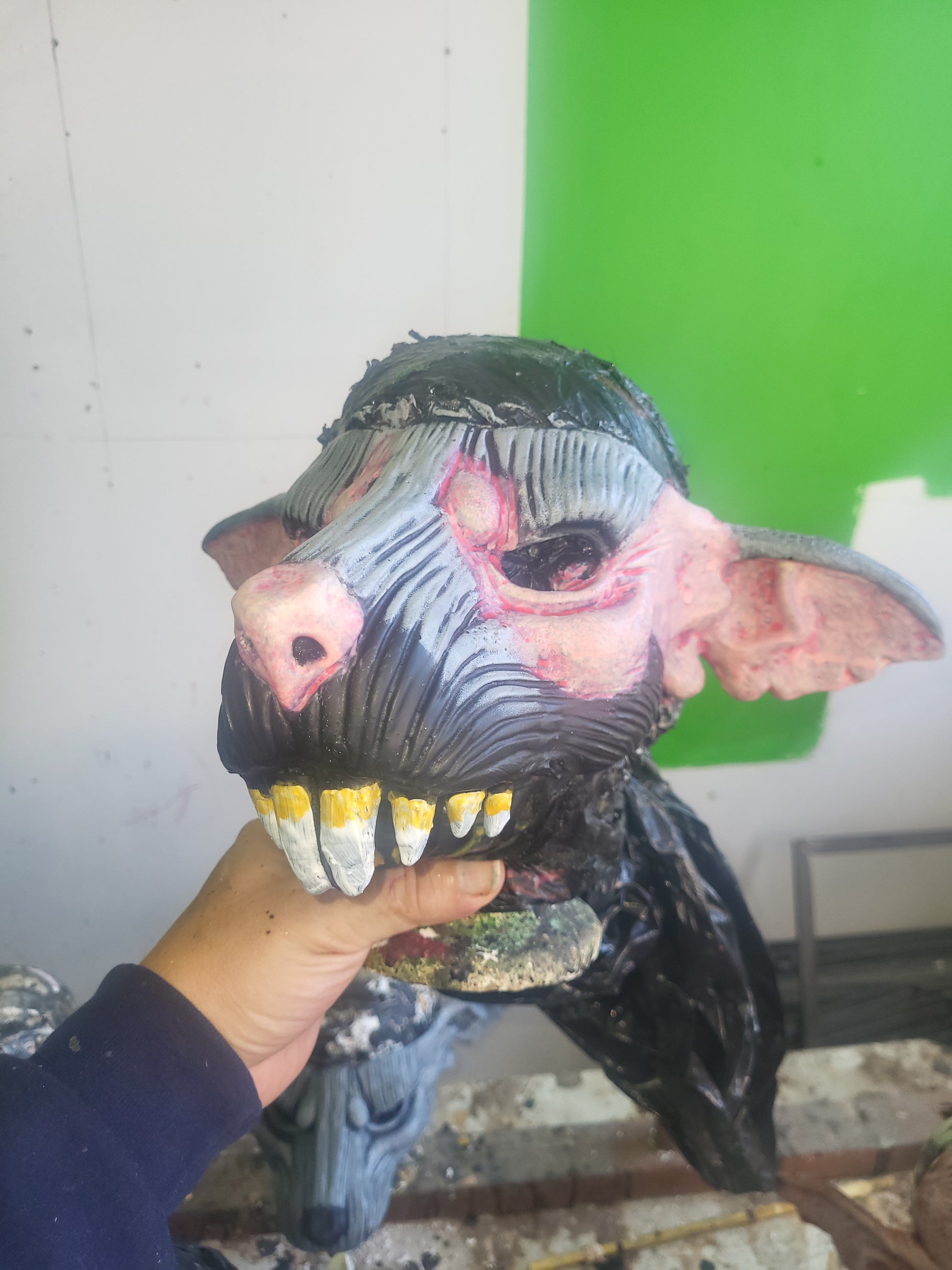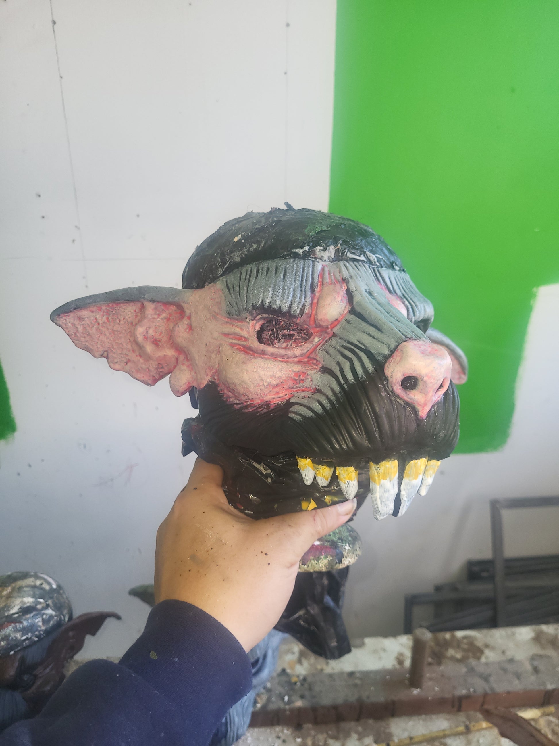 Latex mask reinforced with fabric and hardener. Elastic strap in the back.