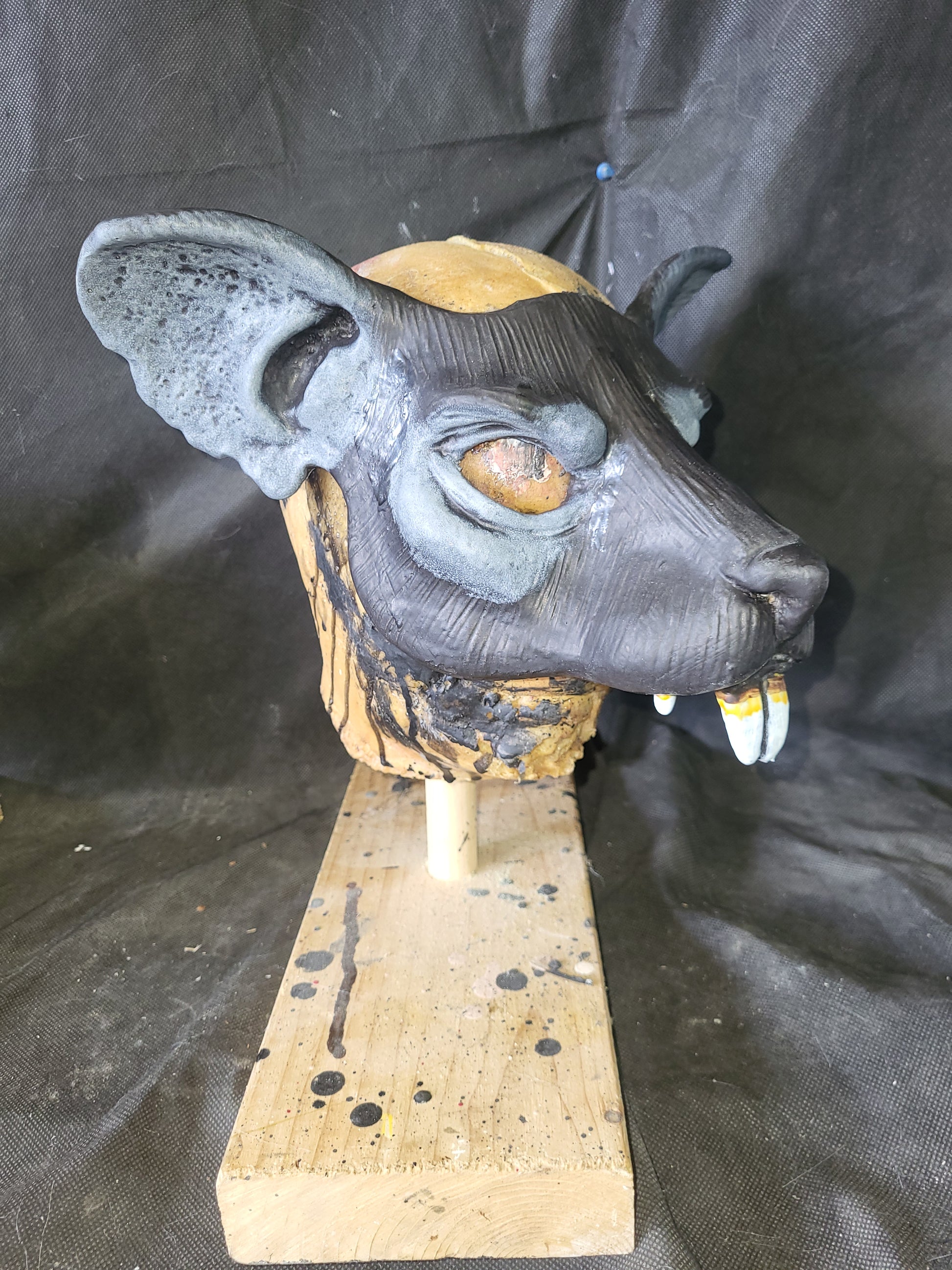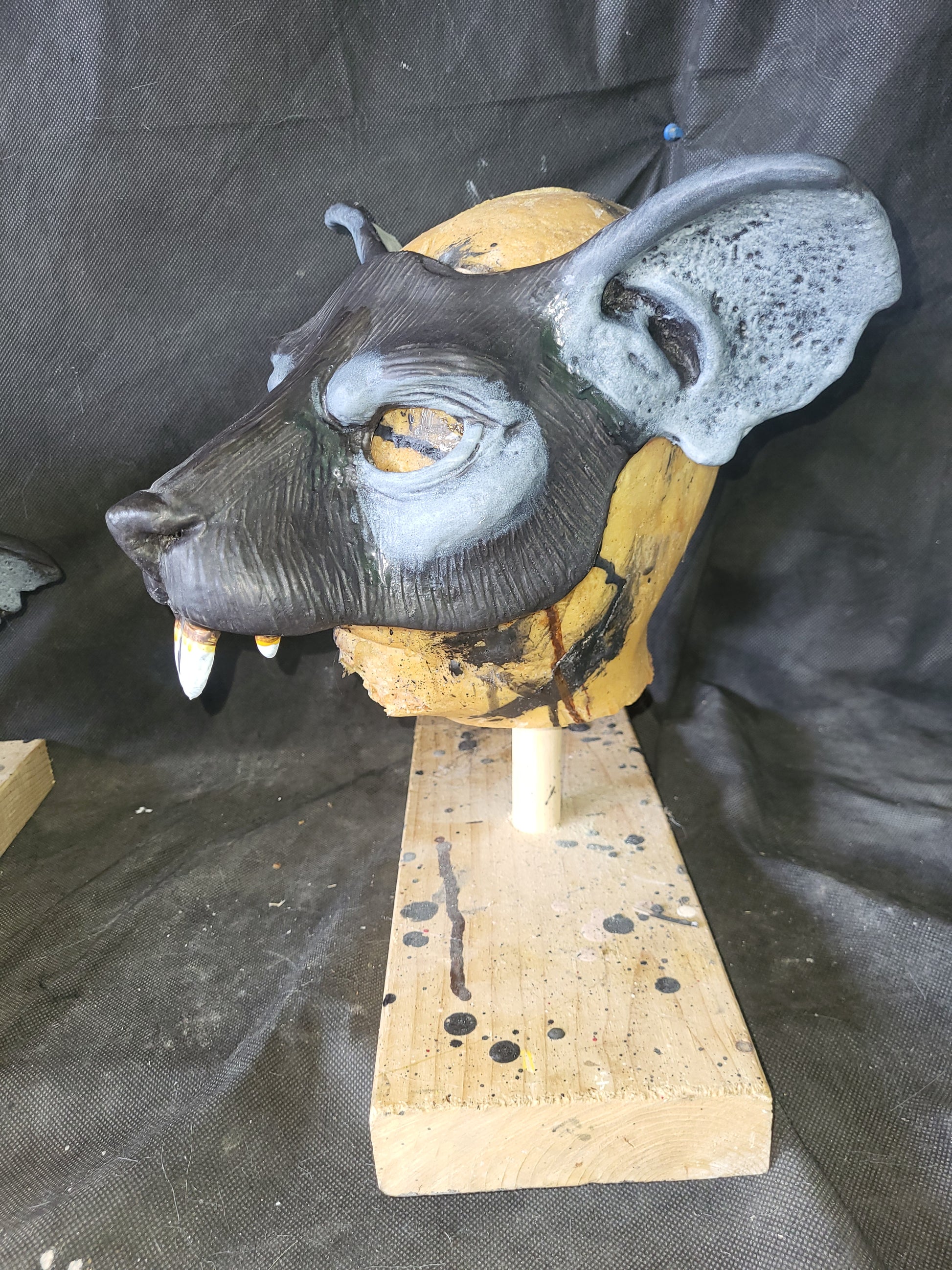 Masque en latex renforcé de tissu et de durcisseur. Poil synthétique et crin de cheval. Elastique en tissu à l' arrière.